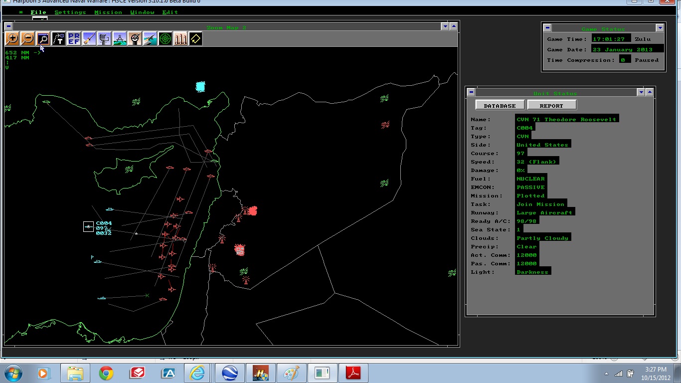 A WMD site is located north of Damascus, is heavy guarded and have several targets to be be neutralized in order to meet the games VC. Also to follow the story line, the ousted leader of Syria is holed up in a bunker inside Damascus and your search aircraft must fly low and slow in order to locate the target. This bunker is also a VC. A Russian arms ship is being escorted into Syria and must be boarded and yet again it is under heavy Russian escort. Boarding is also a VC. A predetermined location inside of Damascus has been labled in order to postion a CH-53E to recover special forces and the helo must be in postion hovering over the location no earlier than 1900Z or the VC will not be met. Just to add a bit of frustration their will be neutral units in the air as well as on the surface.