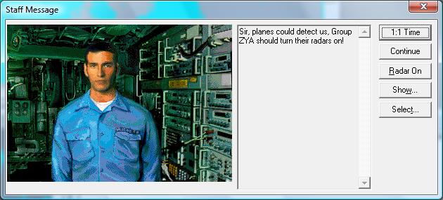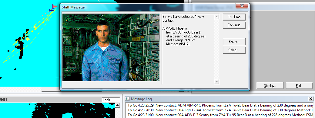 Vow, honored. Also these rules were basically the rules from the DOS version v1.32a as far as I can tell from the release notes and from playing that version. But let me dump here more of my thoughts on jettisoning, what could be done within the game, who knows, some of this might give you ideas that can be implemented. So, aircraft groups which are attacked by a sufficient number of fighters in air-to-air combat will jettison all air-to-ground ordnance (and abort their mission). A significant threat level must be exceeded before attack a/c will jettison. I used "50%" and "0.5" for "significant" but 50% might just be too high, 50% is not an acceptable loss on a single mission IMO. Thus for game rules we look at air groups jettisoning when significant portion of the air group has been destroyed group/side detected significant number of incoming missiles group/side detected significant number of enemy fighters within gun range and the group is known to be detected with high probability 1. significant part destroyed This is the straightforward part, if the group is decimated it jettisons and aborts, even if they did not detect the threat. ** Interesting to play with the thought that this check will also jettison and turn home the group if half (significant part) of them is lost due to pilot error while flying at vlow. A possible side effect but not unrealistic. A crazy brass orders the flight to go tree top for 300nm without TFR??? 2-3 mates hit the dirt the pilots go "up yours!" and turn home. 2. significant number of missiles incoming Important that these are missiles detected by the group or friendlies as discussed above. Significant number is (again, significant=50% only as an example) more incoming missiles than group_size * 0.5 * ph_of_missile If the code makes this possible, I'd use the final ph with modifiers applied, so if, say, there is a standoff EW aircraft in the area that modifies the missile ph it would modify also the jettison decision. As if implying a veteran pilot who trusts the Prowler to toast the enemy radars while going in. Mental note: there might be more than a single detected incoming missile group, which cumulatively exceed the threat level. 3. bandits in gun range This is probably the most complex, since there is no (at least no apparent) detection event linked to bandits closing within gun range. We might get the fix (and the detection event) well outside of gun range and then the bandit just closes in under fix. Fortunately there are several events that I feel relevant (realistic to use) to which the gun range tests can be linked. But first a proposed significant "gun bandit threat number" formula more bandits than group_size * 0.5 * ph_of_guns / gun_rounds_per_fighter and these are of course bandits in range with exact fix on, otherwise we don't know the position, distance, number of them anyway. As for the events, perform "bandits in gun range" test after these events: any member of the group is shot down (see shotdown.jpg). E.g. pilot checks six if wingman goes down. the group is detected by hostile radar (see RWR.jpg). This event seems to be generated at two minutes intervals when the group is within hostile radar detection range. Perfect. Pilot certainly checks six periodically when RWR is alight.** I trust this event also correctly handles stealth aircraft, e.g. B-2 is not reminded by the Staff Assistant to go active when flying into enemy radar. Lets apply the same filter for the jettison test. the group knows it's within visual range of hostiles (see visual.jpg).** Again, apply same filter for jettison as for the general visual detection of stealth a/c. if the group is being engaded by guns (even if it misses). If not before, the group becomes aware when bullets are zipping. These events also solve the "the group knows it's being detected" criteria since these imply that the group has already been detected (1st and 4th point, engaged too) or is probably detected (2nd and 3rd). The jettison is triggered by these events and does not happen immediately when bandits cross the line, which is just as well in a fog of war. An observant theatre commander might want to warn them sooner though a manual jettison key could be handy (CTRL-J?). After jettisoning How to make jettisoning attractive? Make sure the jettisoning aircraft also benefits from it and can defend itself better. (The intercepting one obviously achieves it's goal of defending the HVU easier but also more realistically with jettisoning enforced.) The obvious way is to give a DATA bonus to the jettisoning aircraft. Like aircraft after jettisoning benefits from a modified DATA of ( loadout_DATA + best_loadout_DATA ) / 2 For example an F/A-18 on an Antirunway sortie (Anti-run DATA=20, best_loadout=Intercept DATA=45) could use a DATA of (20+45)/2=32.5 after ditching those durandals. Aborting I guess removing the air-to-ground ordenance triggers the "out-of-ammo returning home" routine already, but that might not always be preferred. A reverse direction and max throttle feels better, the "no orders" and/or "bingo fuel" will catch the group then. But I wonder, when jettisoning, could the AI plot a course that reverses direction of the group uses highest available throttle settings 10nm long with a Staff Note attached to the end "Group XXX has been intercepted, jettisoned a/g ordnance, please plot a course out of the threat zone!" thanks.