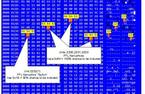 As for renaming the AB, sorry, no clue. Which battleset has this unit btw.? Regarding the SE inclusion probabilities, I can see no way either to get SE to confess, but, well, how desperate are you? Binary comparing two user scenarios which only differ in inclusion probability reveals that unit information is stored in 20 bytes chunks, group name (in ascii text) on bytes 3,4,5 and unit probability on byte 20. The Nanuchkas are group ZZS in Dawn patrol, so I'm looking for string "ZZS" and checking the 18th byte from Z. Assuming the units are listed in same numerical order as in GE then unit ZZ02 "Tyfun" has 30% chance to be included, the other 3 is 100%. See So for a battleset scenario save it as a standalone scenario open it with a hexviewer (this was vbindiff) look for the first appearance of the group name from the start of the file check the 18th byte (in vbindiff this is the byte immediately below the 2nd char of the group name) if you see ascii "d" or 0x64 that's 100, anything less is a probability Of course this was quick&dirty on a small scenario file, so lets hope larger scenarios will not be creative on us. Also here is the complete Dawn hex dump for target practice. dawn.pdf And now I hope someone does not come up in the next post that if you press CTRL-ALT-SHIFT-P the SE burps up a the prob.