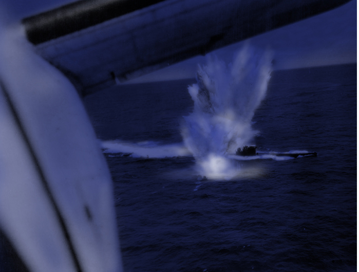 As they roared over the submarine at 190 mph, six depth charges, set 55 feet apart, were falling from “G-George’s” bomb bay, having been released by McDowall whose accuracy this night would be perfect. Three fell on either side of the submarine in a textbook straddling attack just ahead of the conning tower. A flame-float, designed to ignite when it hit the water was also dropped to identify the position of the submarine at the moment of attack. The rear gunner Flight Sergeant I. Webb watched in fascination as the detonations exploded white in the moonlight and appeared to lift the 700-ton submarine out of the water.