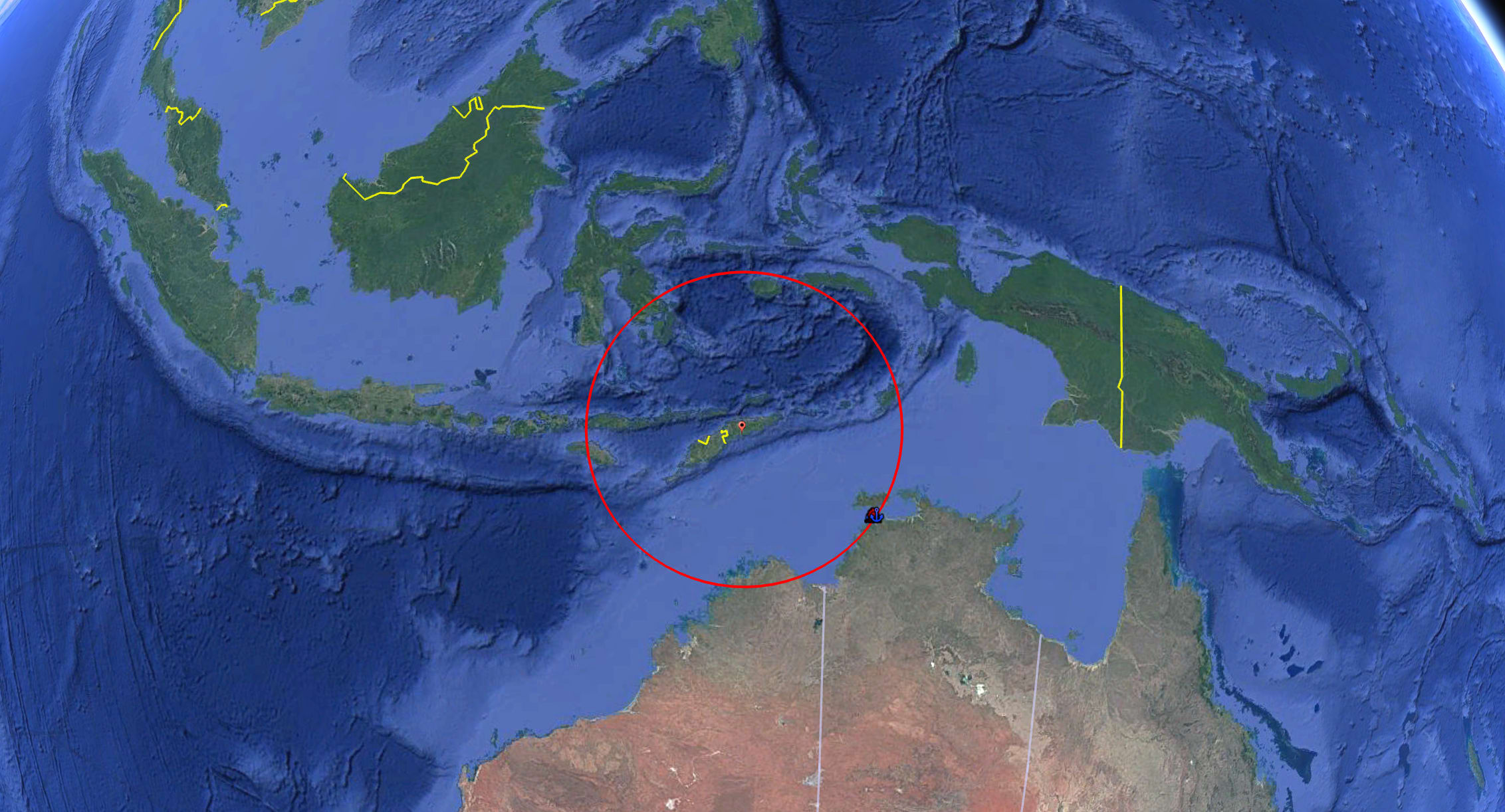 There she is in the center. That red circle is the 360 nautical mile circle that meets where the USMC base is at Darwin, Australia.