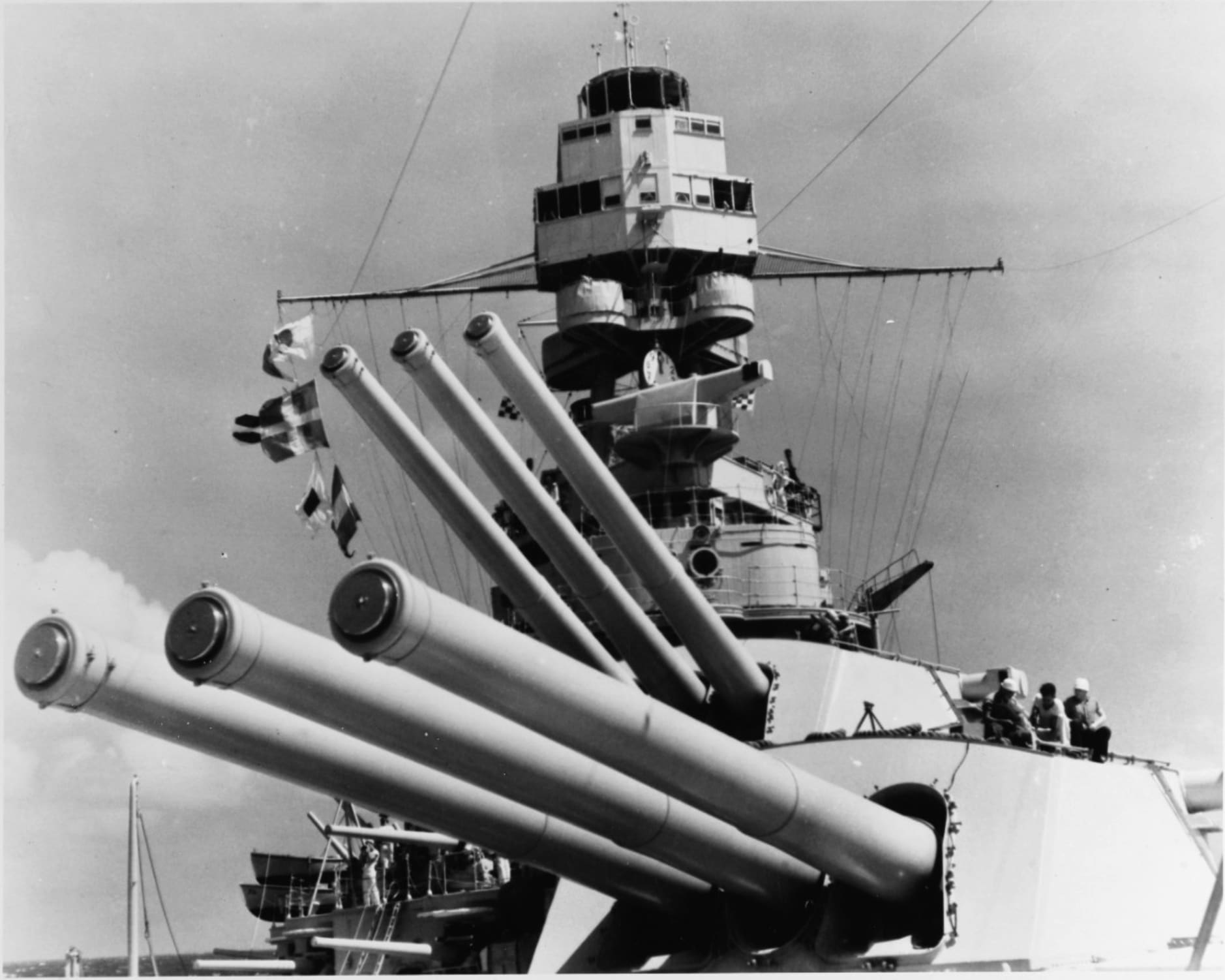 Since her first action at Pearl Harbor she has steamed almost 150,000 miles. Her self discipline had been excellent at all times, no man was ever lost overboard except by enemy action, she had never hit any friendly troops, installations, ships or planes and never had to report “not ready” for any operation. Nearly 150 officers and almost 1000 petty officers were trained and transferred from the PENNSYLVANIA during this period. She probably fired more ammunition than any other ship in history.
